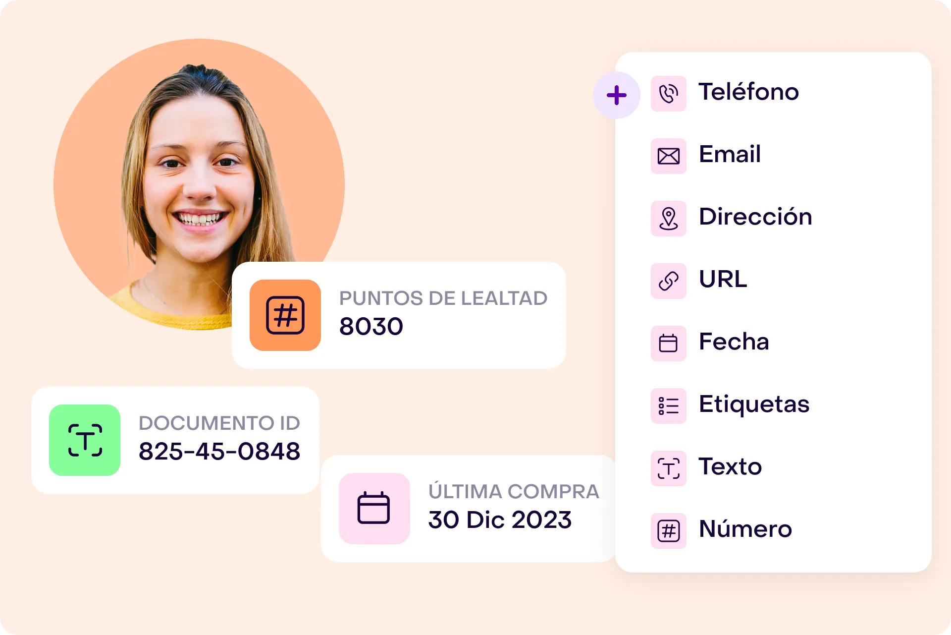 Hellotext organiza eficientemente la información con campos ilimitados para todo tipo de datos, como texto, precio, casillas de verificación, fechas, y más; brindando una visión integral de cada cliente.
