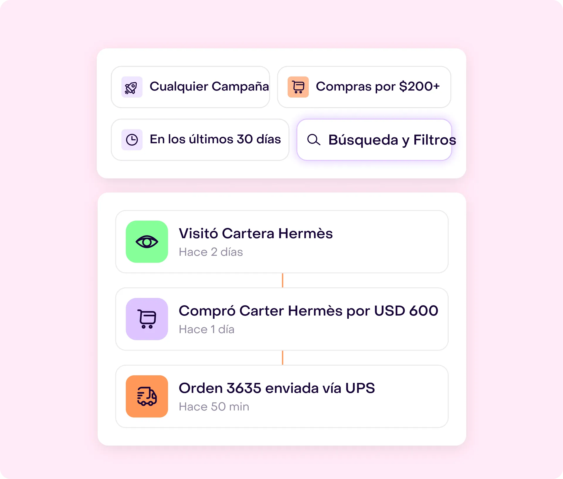 Descubre la potencia y sencillez de nuestras herramientas de búsqueda y filtros, diseñadas para filtrar sin esfuerzo el recorrido del consumidor mediante etiquetas, haciendo que la visualización de eventos sea realmente simple.